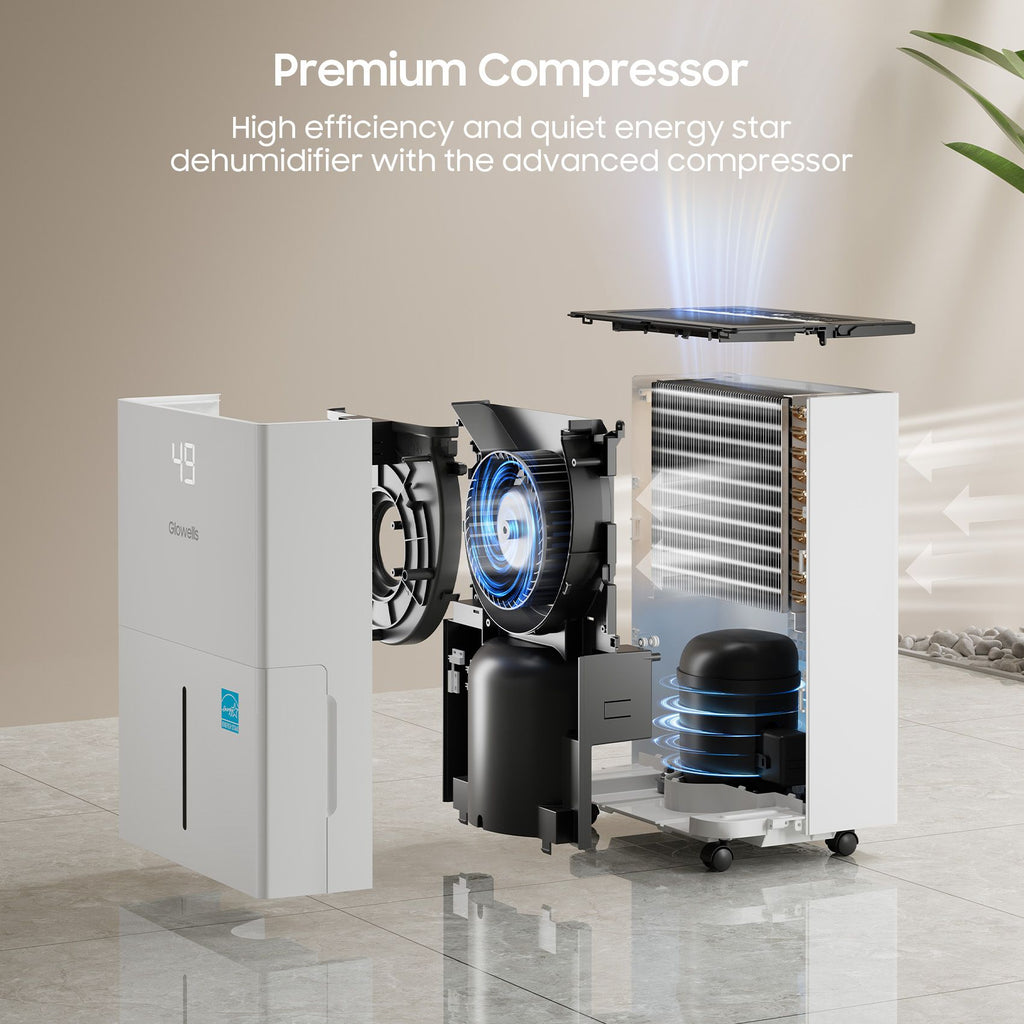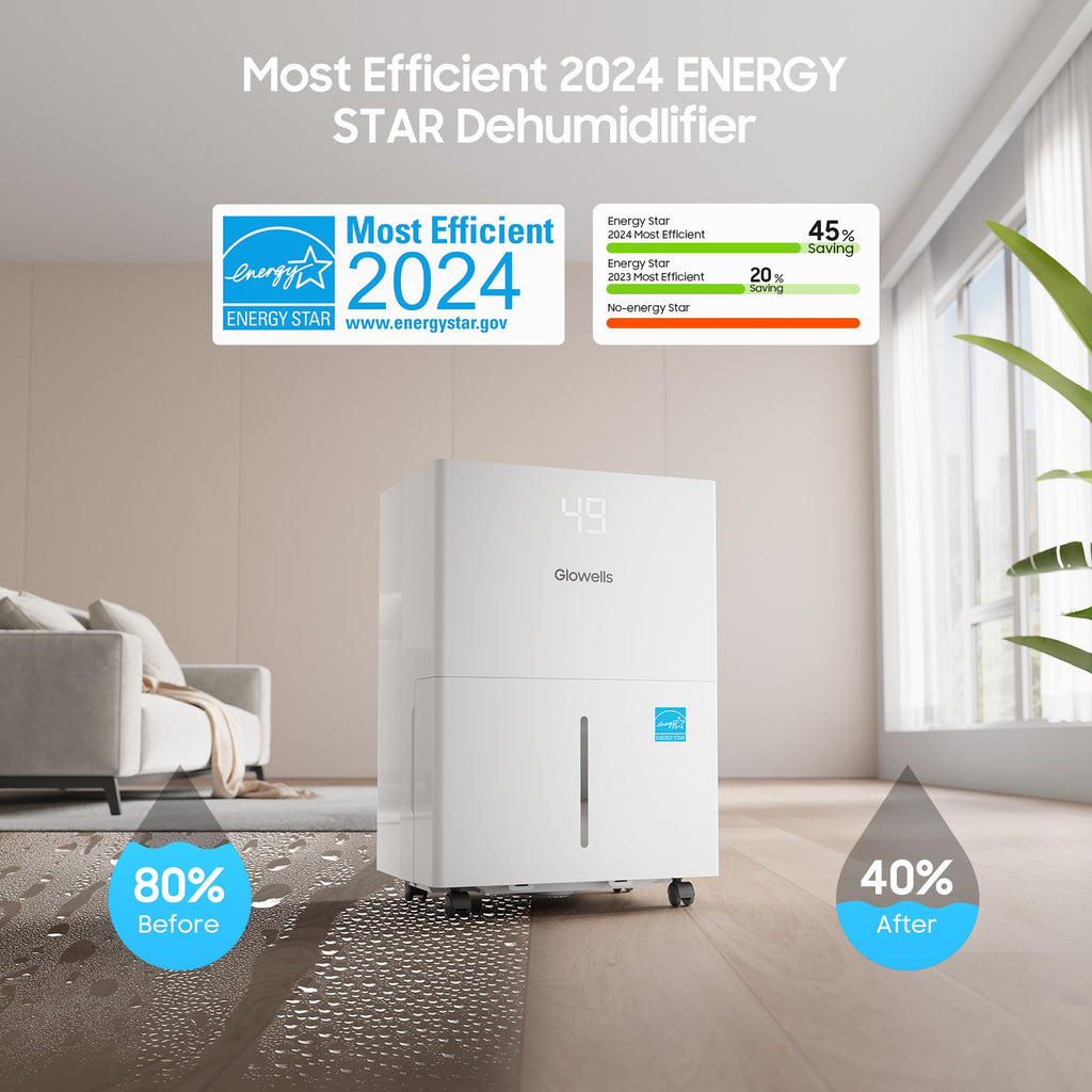 Energy Star Basement Dehumidifier: The Glowells dehumidifier isn't just powerful—it's "Energy Srar" certified. Effectively absorb moisture and energy saving up to 45% than non-cetificated dehumidifier. Max Dehumidification of 120 Pint/D (95℉, 95% RH) Perfect for large spaces 6000 sq.ft like basements, garages, and living rooms.