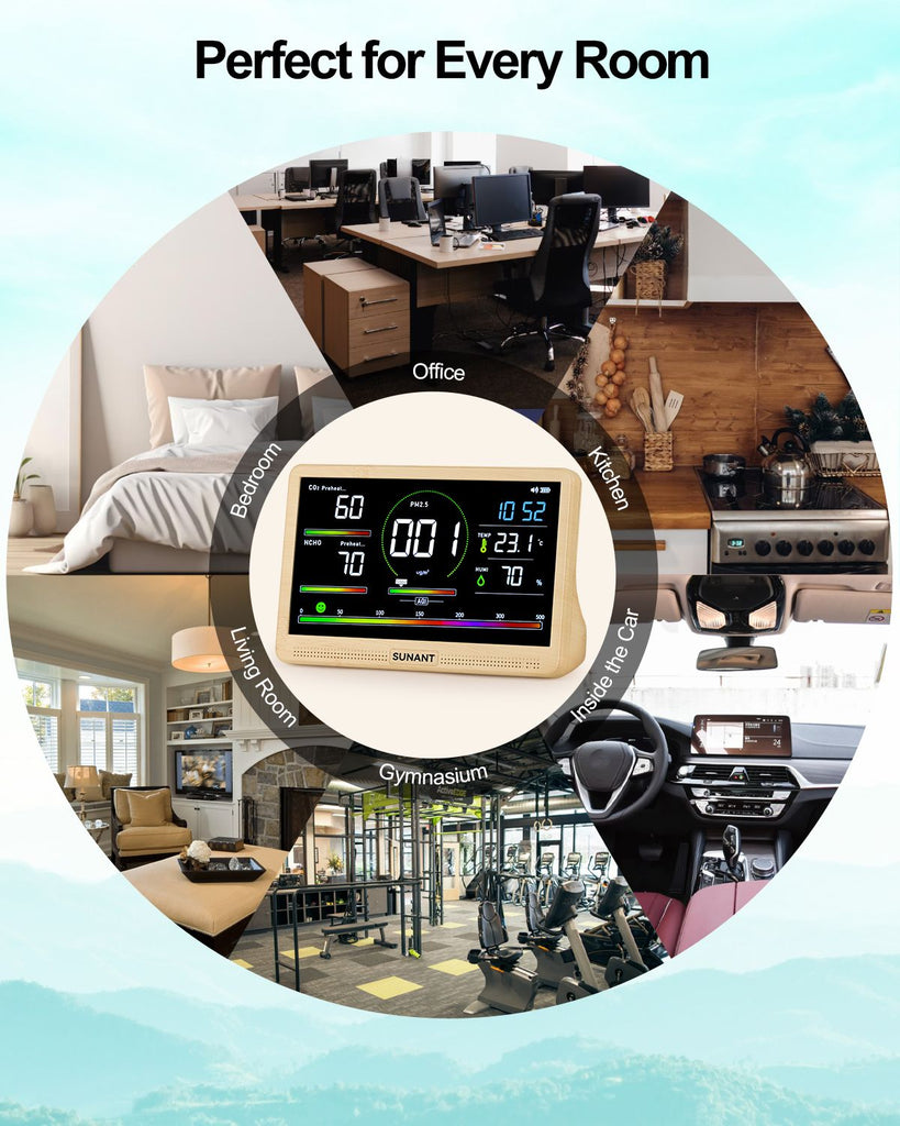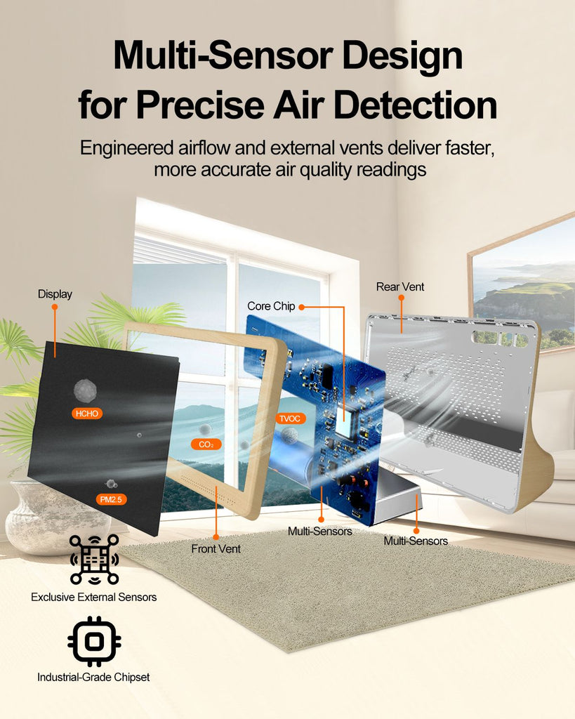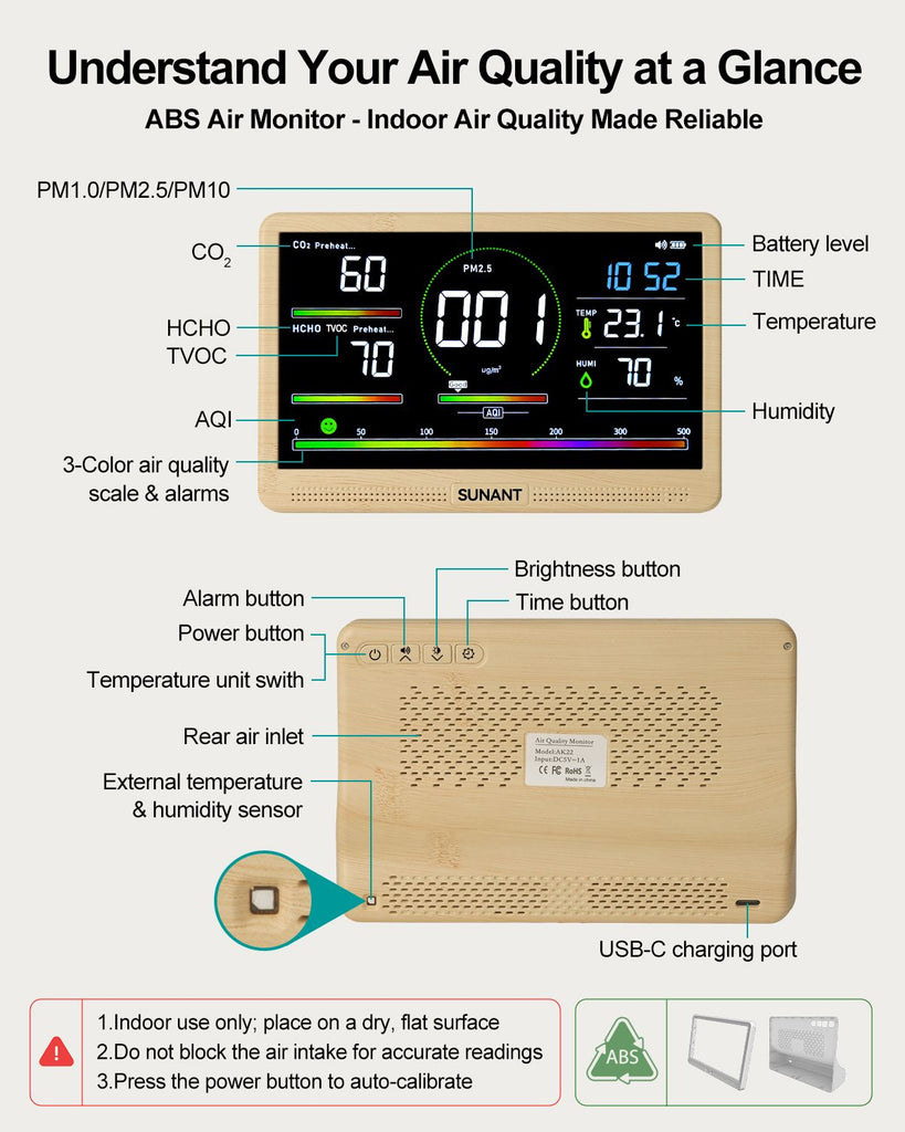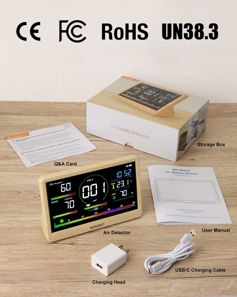 Ideal for Every Indoor Space:Perfect for bedrooms, living rooms, nurseries, offices, kitchens, classrooms, and more. Complete package includes: air quality monitor, USB charging cable, power adapter, user manual, and quick-help card. Dedicated customer service available for missing parts or product issues.
