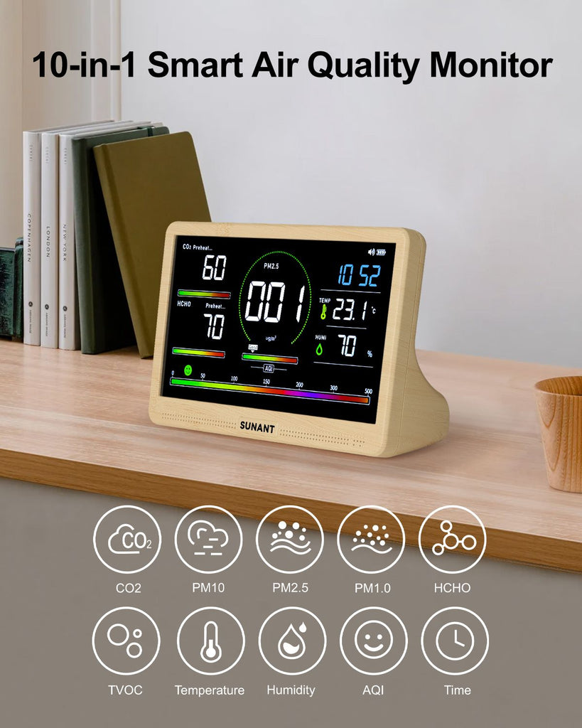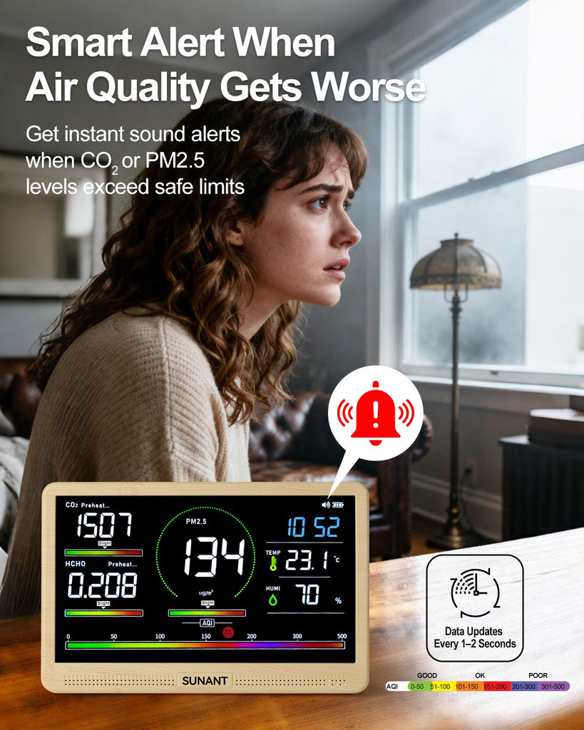 Monitor the key factors that matter most to your indoor health. This 16-in-1 air quality monitor tracks CO₂, PM2.5, PM1.0, PM10, HCHO, TVOC, temperature, humidity, AQI, and real-time clock. When any reading exceeds safe levels, the screen automatically triggers an audible beep alert—helping you take action instantly.