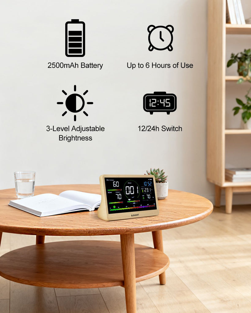 Long-Lasting Rechargeable Power:Home air quality monitor, built with a 2500mAh rechargeable lithium battery and includes a USB cable and dedicated charging adapter. A full 4-hour charge provides up to 6 hours of use. For the most accurate long-term indoor readings, we recommend keeping the device plugged in during operation.