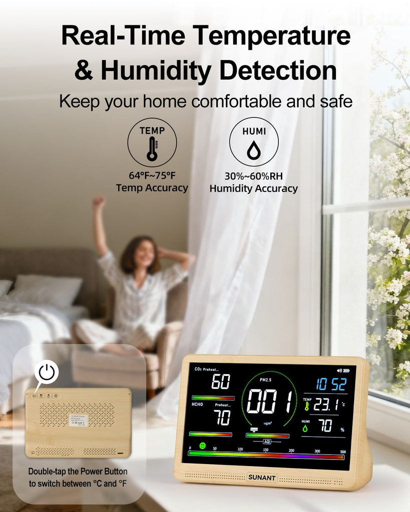 Clear LED Display & Easy Operation:Air quality sensor, equipped with 7 inch a bright, high-resolution LED display for effortless viewing of CO₂, AQI, temperature, and humidity. Features 12/24H time display, °C/°F temperature switching, and 3 adjustable brightness levels—ideal for use in bright rooms or nighttime environments.