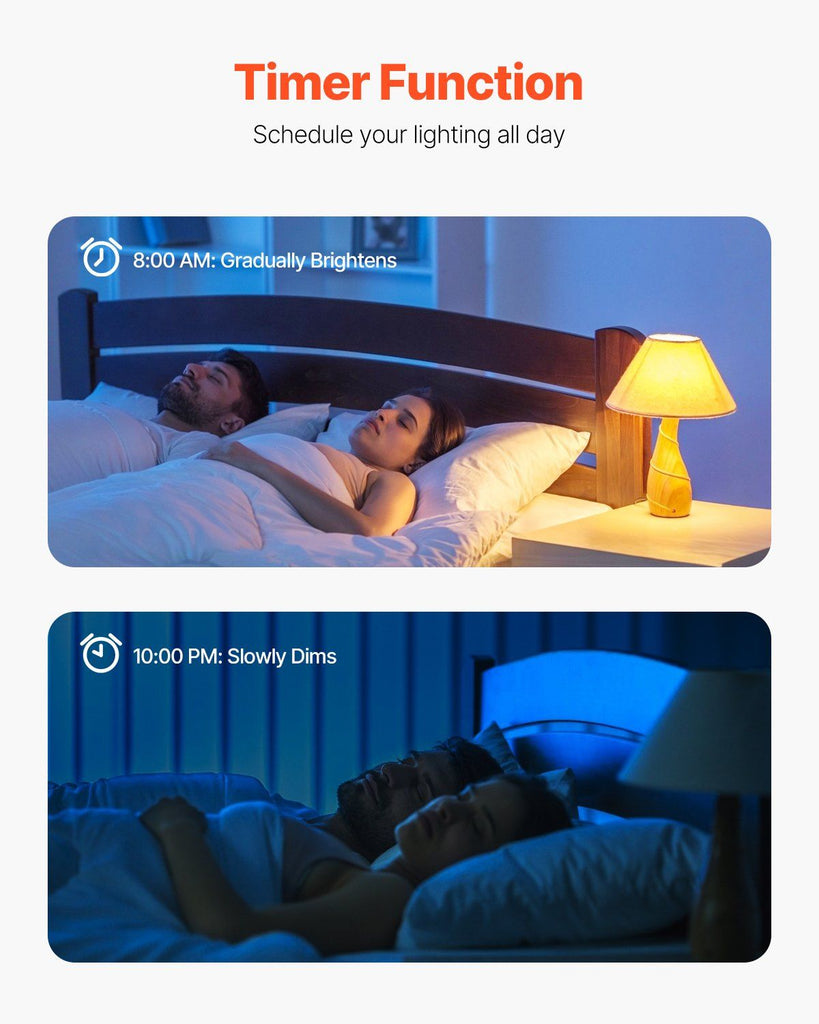 Upgrade your home lighting with VEVOR A19 E26 Smart Light Bulbs (4-Pack), designed for seamless smart control and vibrant customization. These WiFi and Bluetooth-enabled LED bulbs allow you to control brightness, colors, and scenes directly from your smartphone or voice assistant — no hub required.