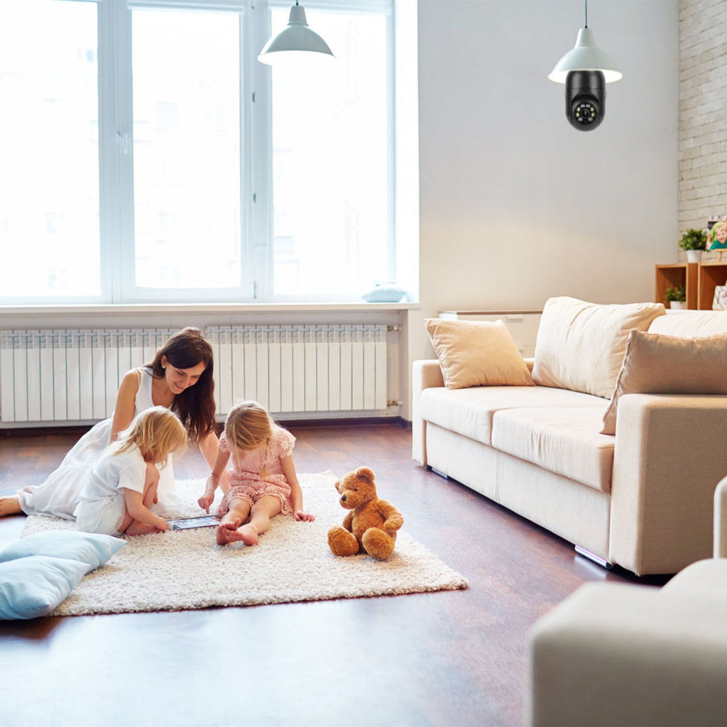 Our 1080P WiFi IP Camera is a good helper for you to keep an eye on your home or office for home & office security from anyplace in the world. Easily adjust the camera horizontally 355° or vertically 90° via the APP to monitor with no blind spot. You can even inform of any happenings at night with IR night vision function. Built-in responsive high-sensitivity microphone and speaker for a clear 2-way intercom, you can hear and talk to your family members at any time via the App. An instant alarm will be sent to you when motion is detected. E27 light socket design makes it quite easy to install this security camera.