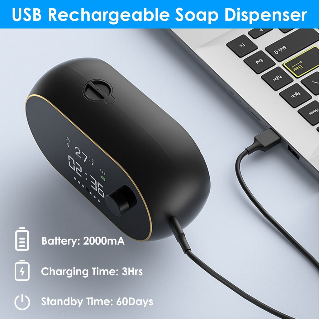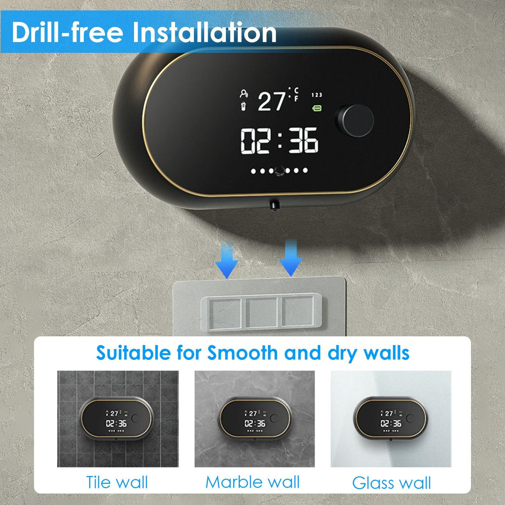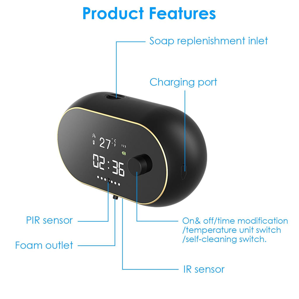 *Dual Sensors*:This automatic soap dispenser features both an infrared motion sensor and a PIR sensor to make sure it doesn’t miss a hand and effectively avoid false triggering. When you approach it,the screen will automatically light up and clearly show current time,temperature,remaining soap and power. Built-in infrared sensor chip will dispense foam timely and accurately once detecting a hand beneath.