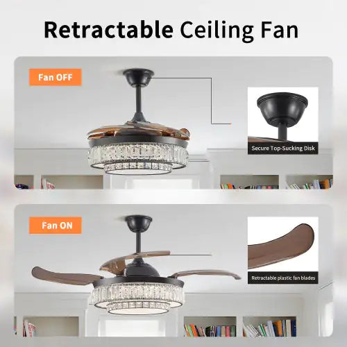 The retractable ceiling fan comes with 4 brown transparent blades for a modern and metallic look. When the fan closes, the blades are automatically retracted or invisible. Our motors are made of thickened silicon steel sheets, thickened copper wires, and precision double bearings, which not only have strong wind speed, quiet performance, but also long life. Beautiful, functional, timeless classic look.